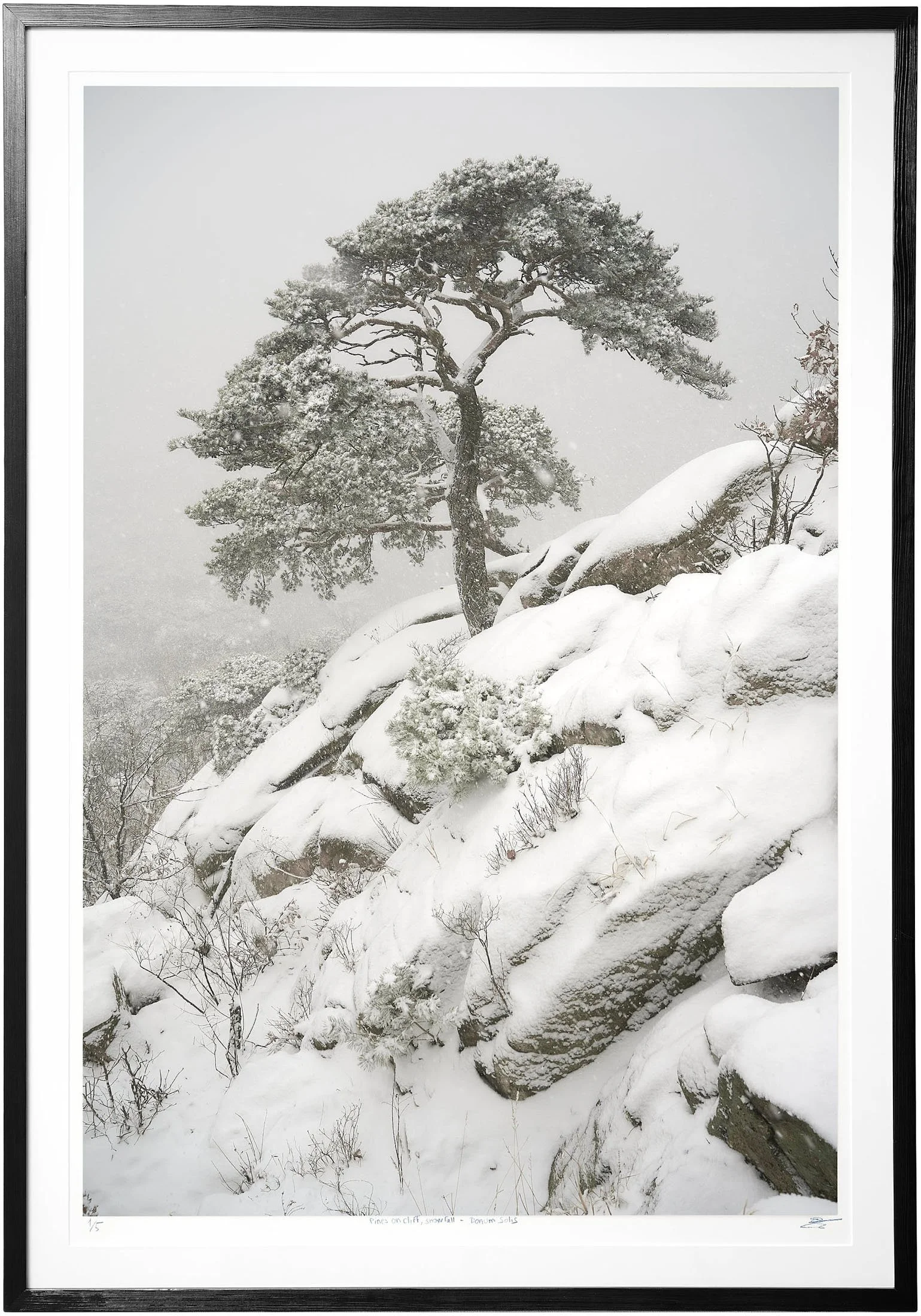 The photographic pieces exhibited are part of an ongoing series called “Pines on cliff”. The series portrays a duo of well-hidden pine trees growing on top of a cliff in all weathers and seasons. Their westward orientation allows for warm sunset light to showcase them uniquely. On a metaphorical level, those pines personify resilience. No matter how hard wind blows, how hot sun shines or cold winter is, they keep growing proudly on top of their rocky home.