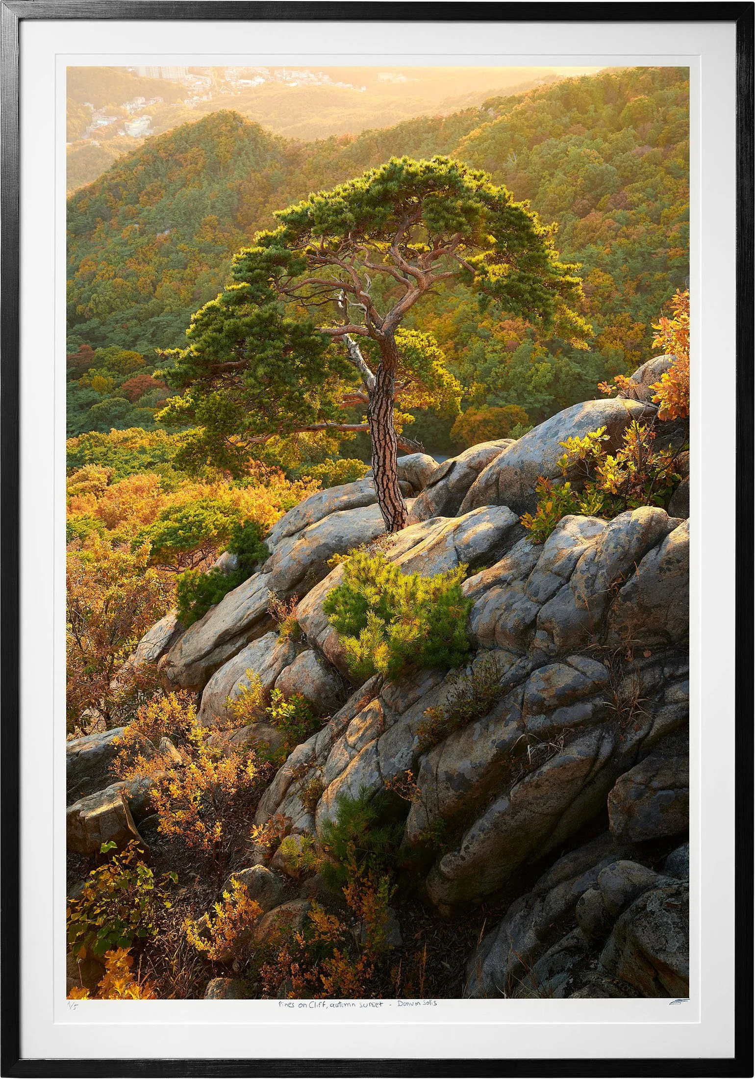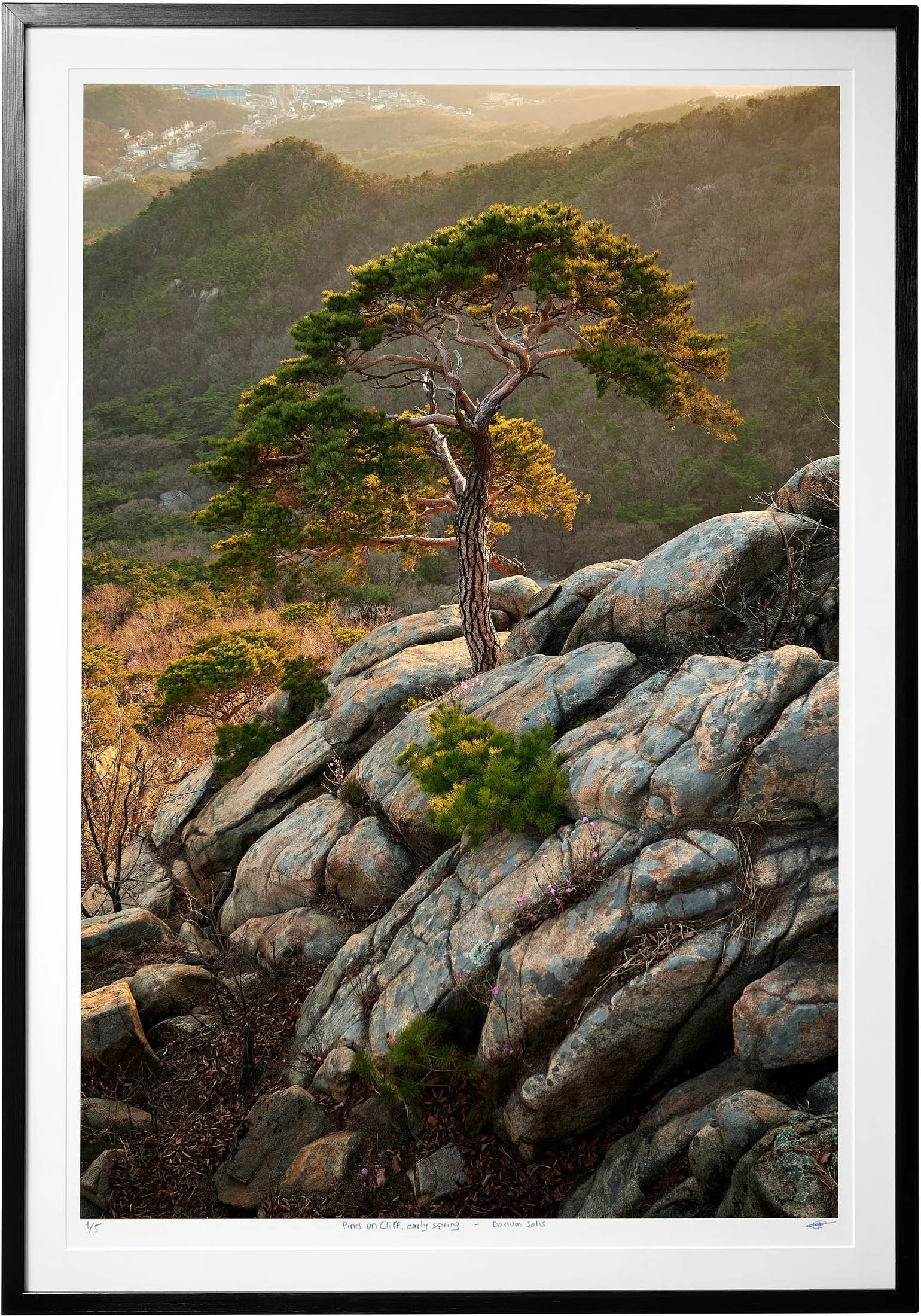 This version is from early spring. It may be hard to see on a small screen but, printed big, you can see spread-out patches of azaleas blooming on the rocks in the foreground and at the foot of the front pine. The color contrast between the warm light and the blue lichen adds a secondary dimension to this image. Let your eyes linger on the foreground and find all the small details that nature put on display for your pleasure.