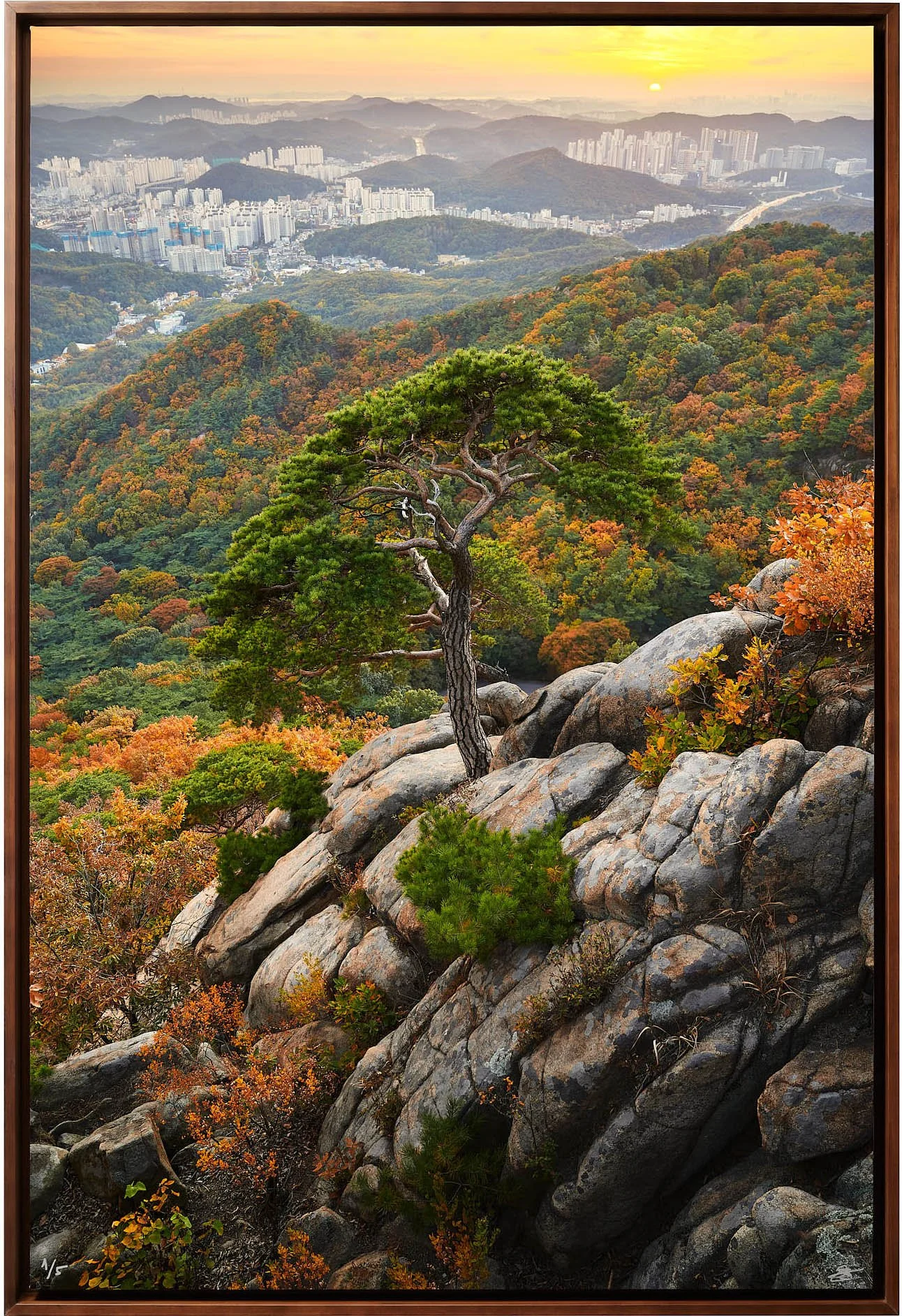 Korean landscape is never as beautiful as during fall. However, pines don’t take part in that fiery transformation. So to emphasize the seasonal change I decided to capture the pair in the warm light of early sunset. The result is a atmospheric image that enhances the surrounding autumnal colors and creates an elegantly warm outline on the pines.