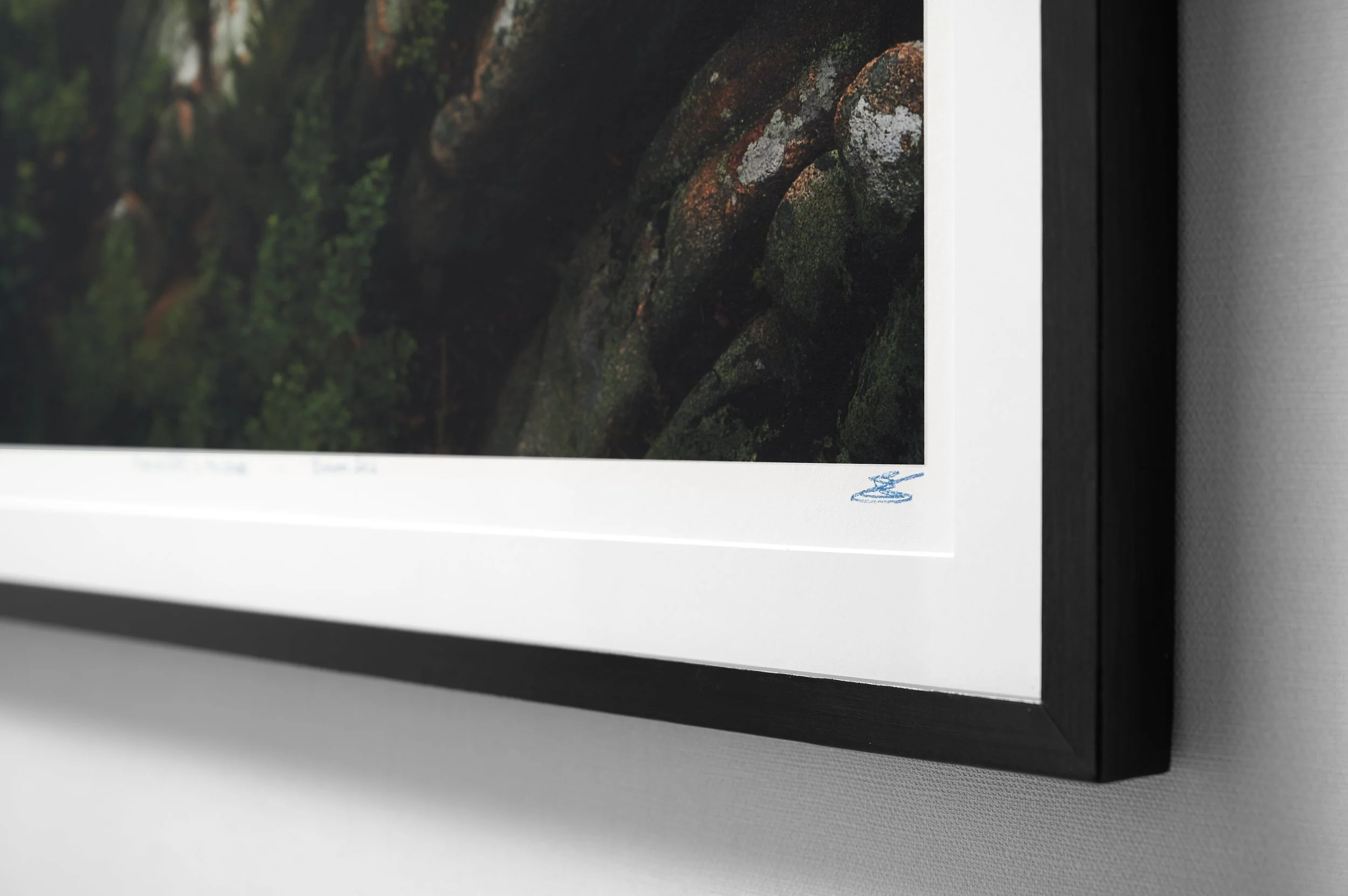 The prints presented during this exhibition are limited editions. The main five frames are 1-meter high hand-brush-dyed pinewood frames, protecting a 90cm print on fine art paper. The accompanying frame is an acrylic floater panel, encased in brown pinewood of the same size. The framing material was thoughtfully selected to reflect the subject of the photographs. Meant to be collection pieces, they are all 1 of 5 prints only.