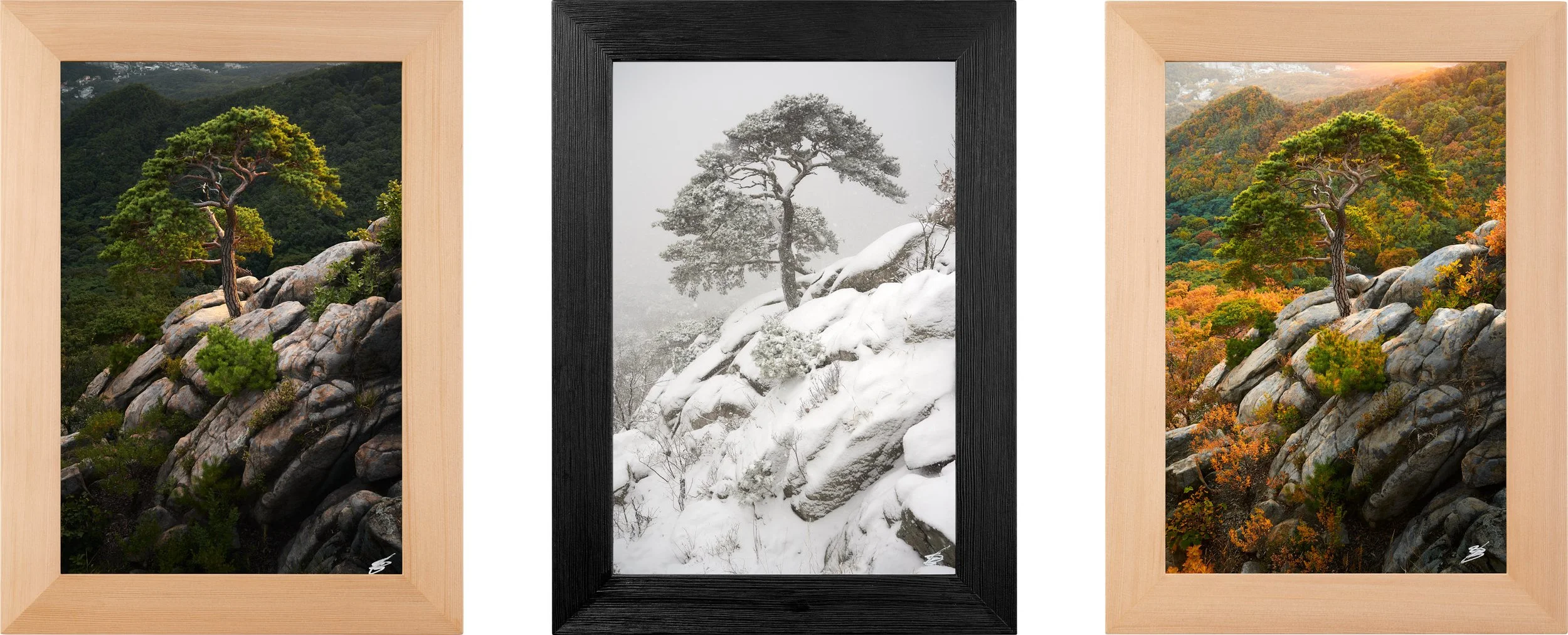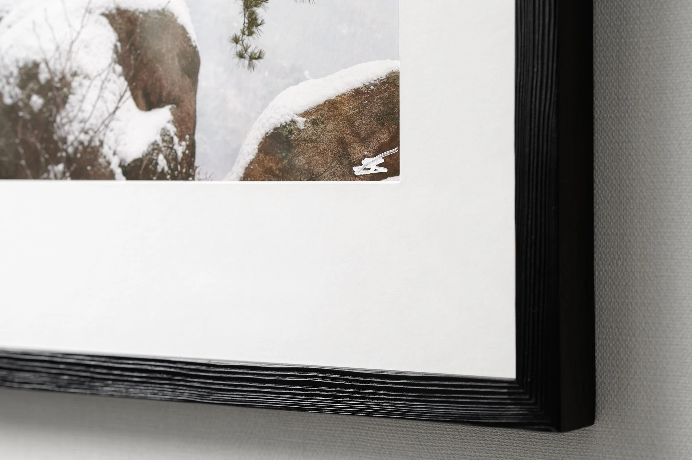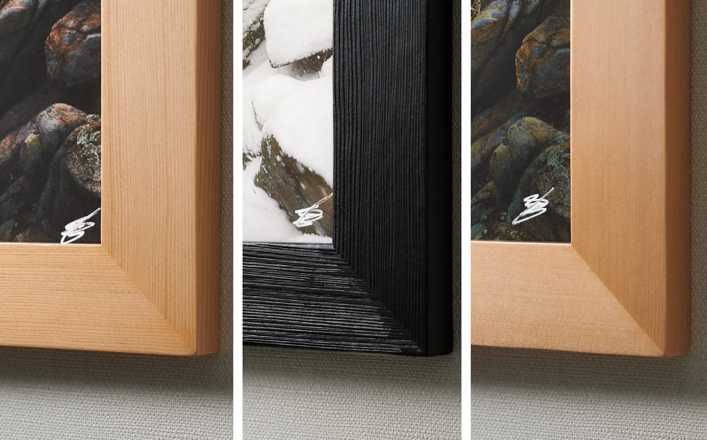 22x41cm - 8.6x16.1inch each, printed on fine art semi-matte paper, two bare pinewood, one brush-died black pinewood frame, signed special edition