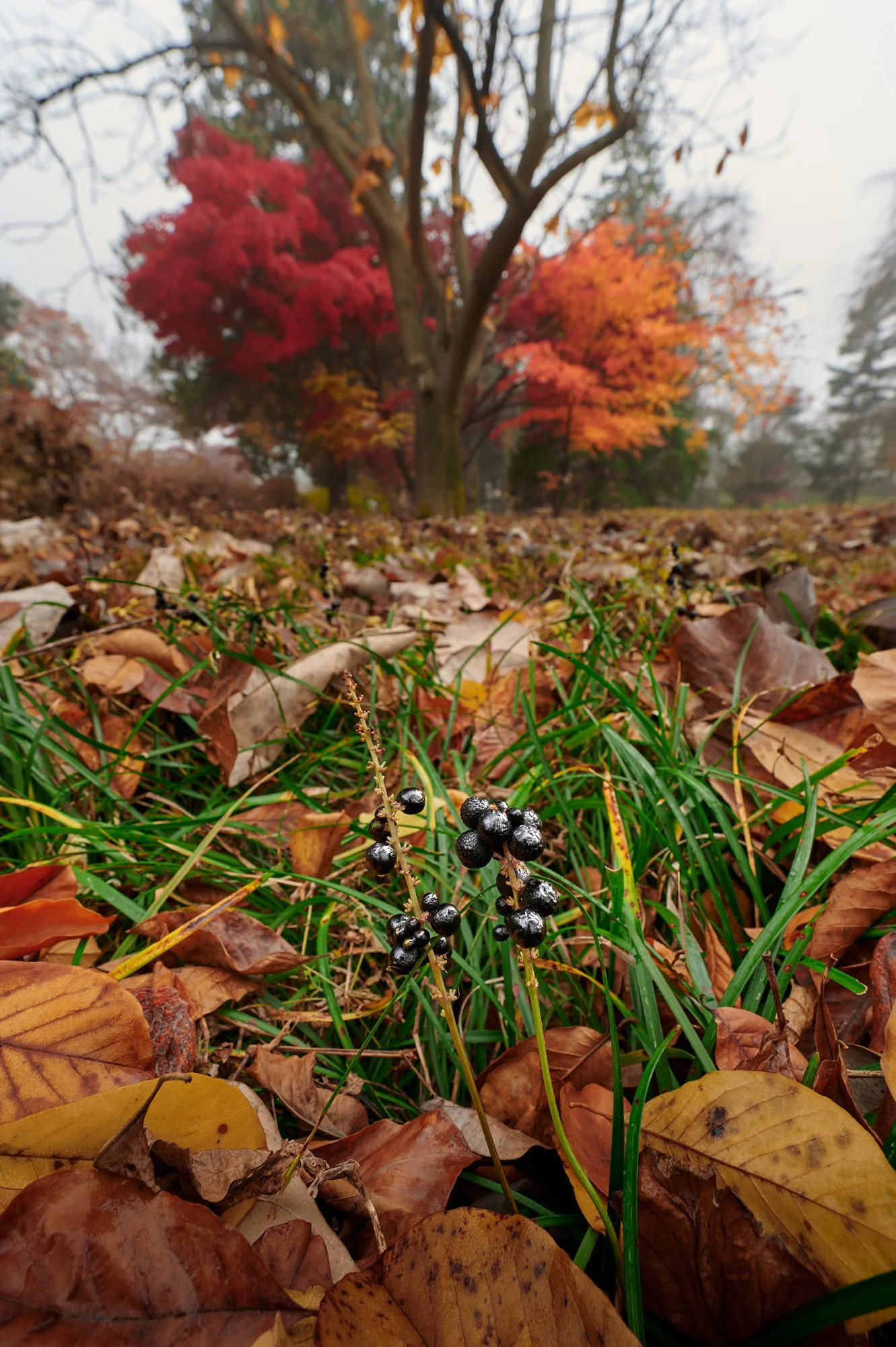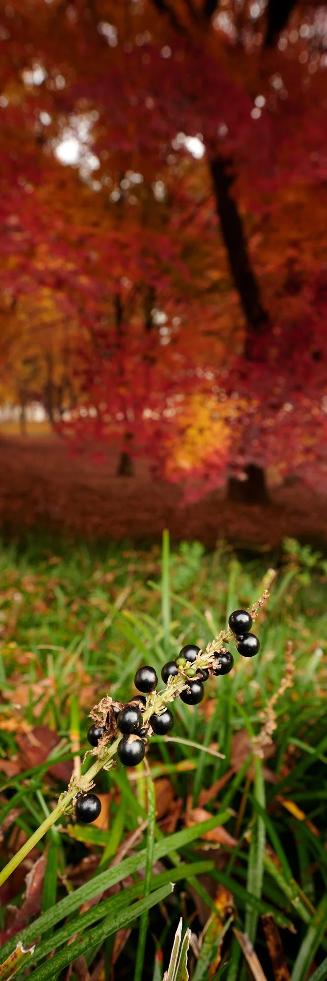 In front of the bi-colored maple branch, I found those tiny berries emerging from the grass. It is a lily turf (맥문동 in Korean), it blooms a gorgeous violet/blue flower in late summer and evolves into the black berries you see here from fall until deep in winter (sometimes all through winter). What caught my eye was the sky reflecting on these obsidian spheres. I like how they mirror the bright holes in the tree above them. This shot I took later in the morning, but the following photos are from earlier, when there still was dew covering the ground…