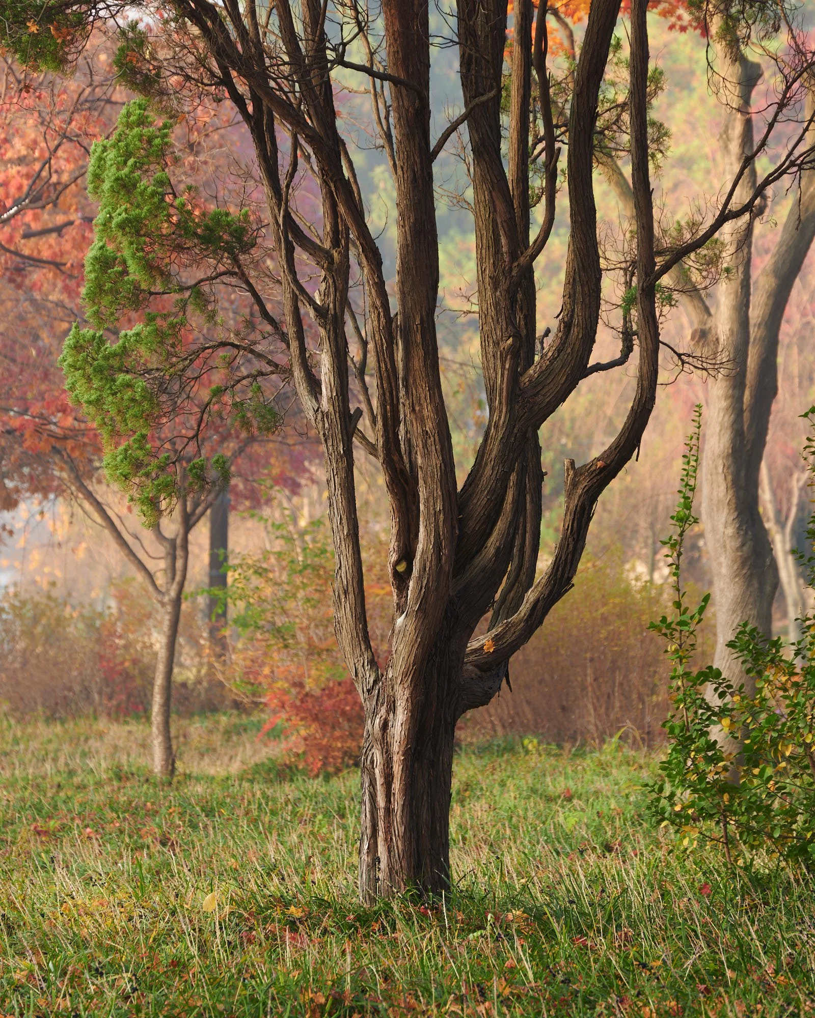 This stunning Korean pine stands (well, leans) on an altar in front of “the” National Cemetery pond. That explains why fog lingers a little longer here than anywhere else, even after the sun has risen above the tree line. The result of this is a strong, direct light that hits the morning mist and gets peacefully diffused around. The second effect of that combination of sunlight and fog is the fairytale-like atmosphere. The third, and the reason why I chose this image as the last one, is that the sun lights up the dew that has settled on the pine needles, effectively creating light needles!