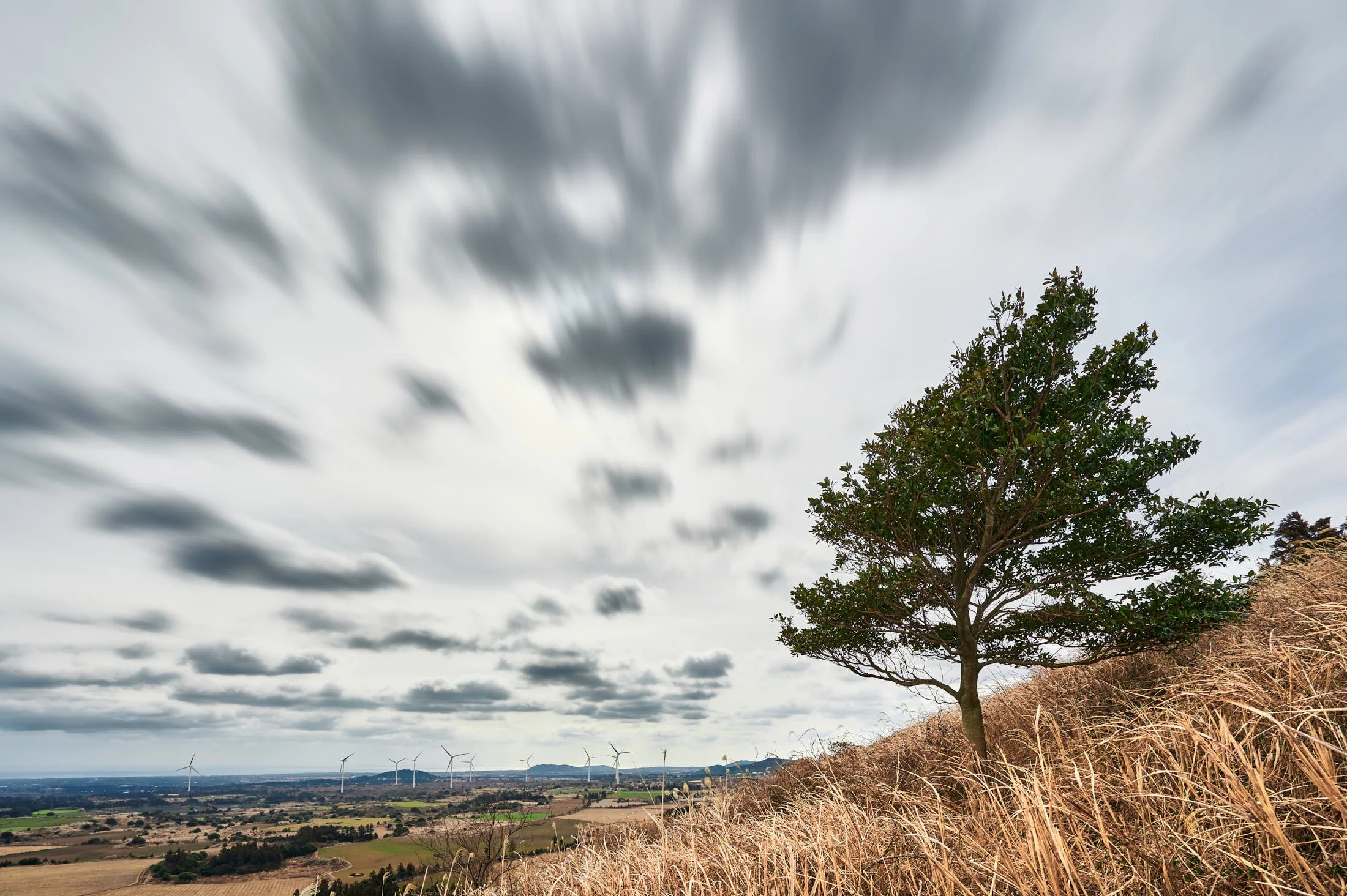 This image I dedicated to wind: the galloping clouds, the wind tilted tree and reeds, and in the background the wind turbines. Wind, one of the three “things” you’ll find everywhere in Jeju.